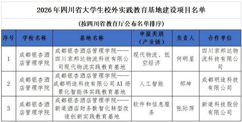 近日,四川省教育厅公布2026年省级大学生校外实践教育基地建设项目名单,成都银杏酒店管理学院申报的3个项目全部入选,立项数量为该校历年最多。